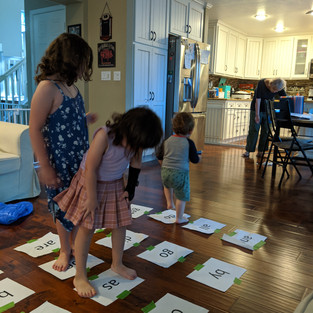 Again, in an effort to provide some movement for the kids under the intense smoky conditions, we've incorporated a lot more kinesthetic learning to our days. Here, Giselle's reviewing a few sight words while Simone and Remy play along.